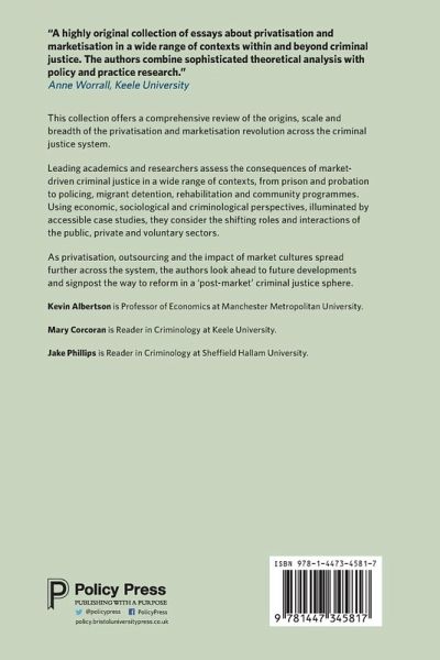 Leading academics assess the causes and impacts of privatisation and marketisation across the criminal justice system in this illuminating and accessible overview. With case studies and economic, sociological and criminological perspectives, they review privatisation and outsourcing in prison, probation and rehabilitation services, scope the paradigmatic shift in the roles of public, private and voluntary sectors and consider future reforms to policy.