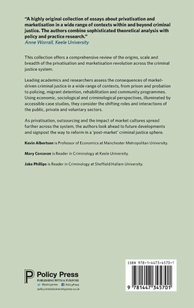 Leading academics assess the causes and impacts of privatisation and marketisation across the criminal justice system in this illuminating and accessible overview. With case studies and economic, sociological and criminological perspectives, they review privatisation and outsourcing in prison, probation and rehabilitation services, scope the paradigmatic shift in the roles of public, private and voluntary sectors and consider future reforms to policy.