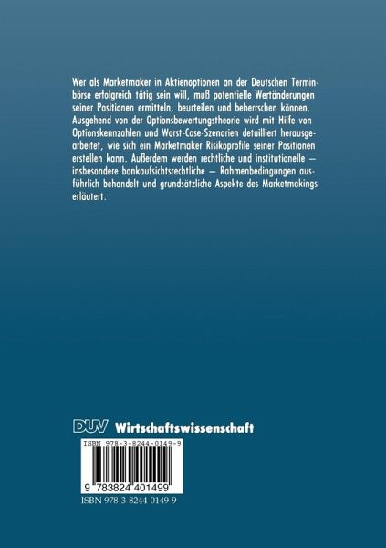Als Anfang 1990 der Handel an der Deutschen Terminberse begann, ruckte auch in Deutschland ein Finanzintermediar in den vordergrund, der bisher kaum in Erscheinung getreten war. Seine Funktion, ahnlich wie die anderer Intermediare, ist es, Stromasynchronitaten zu uberbrucken und dabei Risi ken zu ubernehmen. Seine Domane waren bis auf wei teres die Aktienoptionen. Es lag daher nahe, den Marketmaker in Aktienoptionen in das Zentrum einer wissenschaftlichen Untersuchung zu stellen, die seine Arbeitsweise und die Rahmenbedingungen dafur analysiert und die vor allem herausarbeitet, wie der Marketmaker seine Aktienkurs- und Zeitpramien risiken ermitteln, beurteilen und beherrschen kann. Welche Schwierigkeiten Daube zu uberwinden hatte, der sich diesem untersuchungsprogramm stellte, kann man bei der Lekture seiner Arbeit sehr gut nach vollziehen. Er hatte sich mit der Rolle des Marketmakers im KursfindungsprozeB auseinanderzu set zen, die im Zusammenhang mit den Risiken zu sehen ist, denen Marketmakerbestande ausgesetzt sind. Hierbei konnte Daube sich noch auf eine verlaBliche Literaturbasis stutzen, die auch schon berucksichtigt, daB Insider die Kontrahenten eines Marketmakers sein kennen, was die Ubernahme von Aktienkursrisiken erschwert.