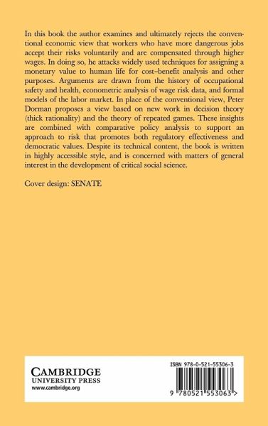 In this book the author examines and ultimately rejects the conventional economic view that workers who have more dangerous jobs accept their risks voluntarily and are compensated through higher wages. In doing so, he attacks widely used techniques for assigning a monetary value to human life for cost-benefit analysis and other purposes. Arguments are drawn from the history of occupational safety and health, econometric analysis of wage and risk data, and formal models of the labor market. In place of the conventional view, Peter Dorman proposes a view based on new work in decision theory (thick rationality) and the theory of repeated games. These insights are combined with comparative policy analysis to support an approach to risk that promotes both regulatory effectiveness and democratic values. Despite its technical content, the book is written in highly accessible style, and is concerned with matters of general interest in the development of critical social science.