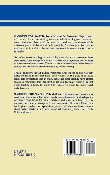 Markets for Water: Potential and Performance dispels many of the myths surrounding water markets and gives readers a comprehensive picture of the way that markets have developed in different parts of the world. It is possible, for example, for a water market to fail, and for the transaction costs in water markets to be excessive.
