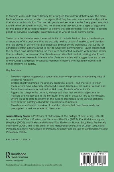 In Markets with Limits James Stacey Taylor argues that current debates over the moral limits of markets have derailed. He argues that they focus on a market-critical position that almost nobody holds: That certain goods and services can be freely given away but should never be bought or sold. And he argues that they focus on a type of argument for this position that there is reason to believe that nobody holds: That trade in certain goods or services is wrongful solely because of what it would communicate.