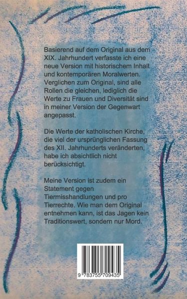 Basierend auf dem Original aus dem XIX. Jahrhundert verfasste ich eine neue Version mit historischem Inhalt und kontemporären Moralwerten.Verglichen zum Original, sind alle Rollen die gleichen, lediglich die Werte zu Frauen und Diversität sind in meiner Version der Gegenwart angepasst.Die Werte der katholischen Kirche, die viel der ursprünglichen Fassung des XII. Jahrhunderts veränderten, habe ich absichtlich nicht berücksichtigt.Meine Version ist zudem ein Statement gegen Tiermisshandlungen und pro Tierrechte. Wie man dem Original entnehmen kann, ist das Jagen kein Traditionswert, sondern nur Mord.