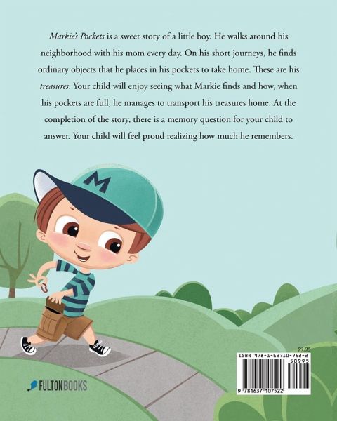 Markie's Pockets is a sweet story of a little boy. He walks around his neighborhood with his mom every day. On his short journeys, he finds ordinary objects that he places in his pockets to take home. These are his treasures. Your child will enjoy seeing what Markie finds and how, when his pockets are full, he manages to transport his treasures home. At the completion of the story, there is a memory question for your child to answer. Your child will feel proud realizing how much he remembers.