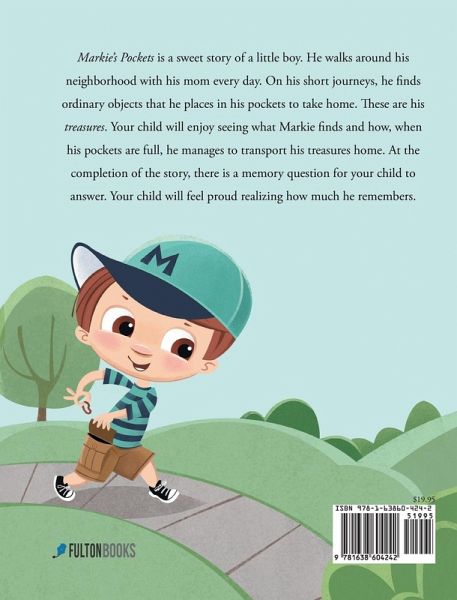 Markie's Pockets is a sweet story of a little boy. He walks around his neighborhood with his mom every day. On his short journeys, he finds ordinary objects that he places in his pockets to take home. These are his treasures. Your child will enjoy seeing what Markie finds and how, when his pockets are full, he manages to transport his treasures home. At the completion of the story, there is a memory question for your child to answer. Your child will feel proud realizing how much he remembers.