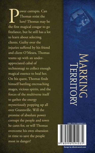 Power corrupts. Can Thomas resist the lure? Thomas may be the first magical cougar to go freelance, but he still has a lot to learn about selecting clients. Guilty over the injuries suffered by his friend and client O'Meara, Thomas resolves to collect enough magical essence to get her healed. Teaming up with an under-appreciated cabal of technomagi, Thomas finds himself battling encroaching mages, vicious spirits, and the forces of the multiverse itself to gather the energy mysteriously popping up all over Grantsville. Will the promise of absolute power corrupt the people and town he cares for, or will Thomas overcome his own obsession in time to save the people most in danger? Marking Territory continues Thomas' adventures in the second installment of Freelance Familiars. If you like the Dresden Files, you'll love this darkly humorous urban fantasy with an animal twist.