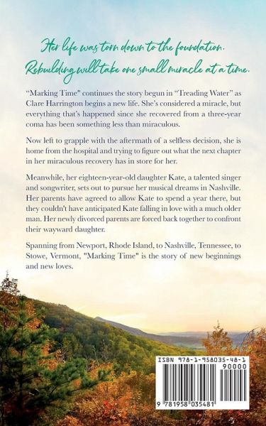 Her life was torn down to the foundation. Rebuilding will take one small miracle at a time. "Marking Time" continues the story begun in "Treading Water" as Clare Harrington begins a new life. She's considered a miracle, but everything that's happened since she recovered from a three-year coma has been something less than miraculous. Now left to grapple with the aftermath of a selfless decision, she is home from the hospital and trying to figure out what the next chapter in her miraculous recovery has in store for her. Meanwhile, her eighteen-year-old daughter Kate, a talented singer and songwriter, sets out to pursue her musical dreams in Nashville. Her parents have agreed to allow Kate to spend a year there, but they couldn't have anticipated Kate falling in love with a much older man. Her newly divorced parents are forced back together to confront their wayward daughter. Spanning from Newport, Rhode Island, to Nashville, Tennessee, to Stowe, Vermont, "Marking Time" is the story of new beginnings and new loves.