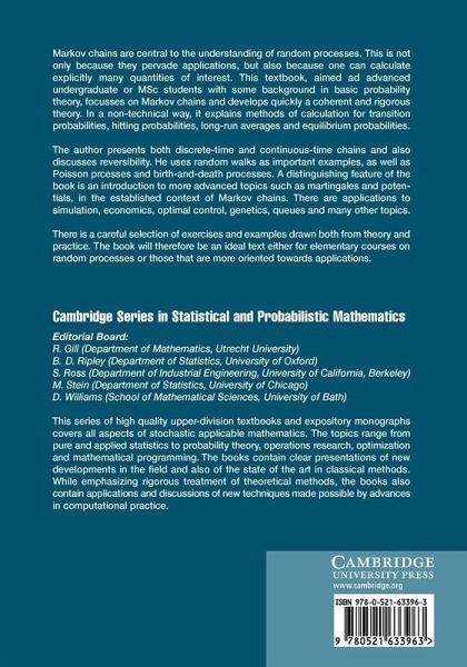 A textbook for students with some background in probability that develops quickly a rigorous theory of Markov chains and shows how actually to apply it, e.g. to simulation, economics, optimal control, genetics, queues and many other topics, and exercises and examples drawn both from theory and practice.