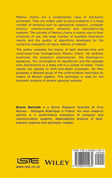 Markov Chains: Theory and Applications Markov chains are a fundamental class of stochastic processes. They are widely used to solve problems in a large number of domains such as operational research, computer science, communication networks and manufacturing systems. The success of Markov chains is mainly due to their simplicity of use, the large number of available theoretical results and the quality of algorithms developed for the numerical evaluation of many metrics of interest. The author presents the theory of both discrete-time and continuous-time homogeneous Markov chains. He carefully examines the explosion phenomenon, the Kolmogorov equations, the convergence to equilibrium and the passage time distributions to a state and to a subset of states. These results are applied to birth-and-death processes. He then proposes a detailed study of the uniformization technique by means of Banach algebra. This technique is used for the transient analysis of several queuing systems.