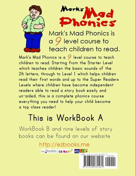 Mark's Mad Phonics is a 9 level course to teach children to read. This is Workbook A comprising of three levels. Starting from the Starter Level which teaches children the basic sounds of the 26 letters, through to level 1 and 2 which helps children read their first words. This workbook contains hundreds of worksheets and activities to learn and practise phonic sounds. It is designed to accompany the first levels of Mark's Mad Phonics Readers, a set of reading books of short, funny stories for kids.
