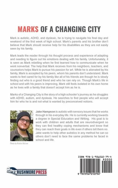 Mark is autistic, ADHD, and dyslexic, he is trying to navigate his final day and weekend of the first week of high school. Mark's parents and his brother don't believe that Mark should receive help for his disabilities as they are not easily seen by his family. Mark leads the reader through his thought process and experience of adapting and needing to figure out his emotions dealing with his family. Unfortunately, it is seen as Mark rebelling when he first learned how to communicate when he went nonverbal. The help that Mark receives from his neighbors, teachers, and counselors helps Mark to pursue his passion for art. While he is alienated by his family, Mark is accepted by his peers, whom his parents don't understand. Mark wants to feel cared for by his family like all of his friends are though he is slowly finding out who is a good friend and who he can rely on. Though Mark's life in school and with his peers is improving, Mark still feels isolated in his own home as he lives with a family that doesn't accept him as he is. Marks of a Changing City is the story of a high schooler's journey as he struggles with ADHD, autism, and dyslexia. He searches to find people who will accept him for who he is and not what is wanted by preconceived notions.