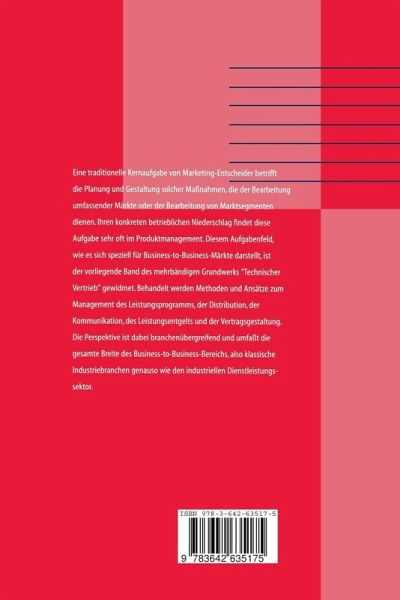 Eine traditionelle Kernaufgabe von Marketing-Entscheider betrifft die Planung und Gestaltung solcher Maßnahmen, die der Bearbeitung umfassender Märkte oder von Marktsegmenten dienen. Ihren konkreten betrieblichen Niederschlag findet diese Aufgabe sehr oft im Produktmanagement. Diesem Aufgabenfeld, wie es sich speziell für Business-to-Business-Märkte darstellt, ist der vorliegende Band des mehrbändigen Grundwerks "Technischer Vertrieb" gewidmet. Behandelt werden Methoden und Ansätze zum Management des Leistungsprogramms, der Distribution, der Kommunikation, des Leistungsentgelts und der Vertragsgestaltung. Die Perspektive ist dabei branchenübergreifend und umfaßt die gesamte Breite des Business-to-Business-Bereichs, also klassische Industriebranchen genauso wie den industriellen Dienstleistungssektor.