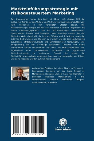 Das Unternehmen hinter dem Buch ist K-Bear, LLC, dessen CEO die exklusiven Rechte für den Verkauf und Vertrieb von Eukalyptusprodukten von FGB, Australien, in den Vereinigten Staaten besitzt. Die Markteinführungsstrategie besteht aus mehreren Schritten: Beginnend mit einem Zielsetzungsprozess, der die WOTS-UP-Analyse (Weaknesses, Opportunities, Threats, and Strengths Under Planning) einsetzt, bei der Marketing Works dabei hilft, die internen Stärken und Schwächen sowie die externen Bedrohungen und Chancen zu ermitteln und sie dem Marketing-Mix zuzuordnen, Wettbewerbsvorteile und Eintrittsbarrieren festzulegen, eine Budgetierung auf der Grundlage geschätzter Umsätze und damit verbundener Kosten vorzunehmen und dann die Wahrscheinlichkeit des Ergebnisses einer konservativen, moderaten und aggressiven Marketingstrategie zu bestimmen. Sobald der Kunde die Markteinführungsstrategie genehmigt hat, wird sie umgesetzt und K-Bear und seine Produkte werden auf den Markt gebracht.