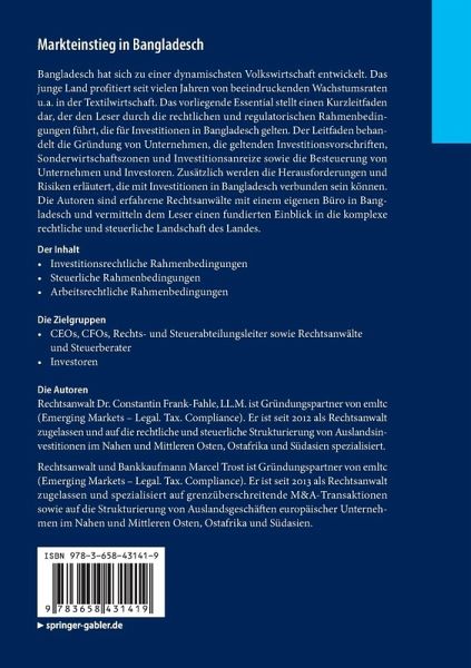 Bangladesch hat sich zu einer dynamischsten Volkswirtschaft entwickelt. Das junge Land profitiert seit vielen Jahren von beeindruckenden Wachstumsraten u.a. in der Textilwirtschaft. Das vorliegende Essential stellt einen Kurzleitfaden dar, der den Leser durch die rechtlichen und regulatorischen Rahmenbedingungen führt, die für Investitionen in Bangladesch gelten. Der Leitfaden behandelt die Gründung von Unternehmen, die geltenden Investitionsvorschriften, Sonderwirtschaftszonen und Investitionsanreize sowie die Besteuerung von Unternehmen und Investoren. Zusätzlich werden die Herausforderungen und Risiken erläutert, die mit Investitionen in Bangladesch verbunden sein können. Die Autoren sind erfahrene Rechtsanwälte mit einem eigenen Büro in Bangladesch und vermitteln dem Leser einen fundierten Einblick in die komplexe rechtliche und steuerliche Landschaft des Landes.