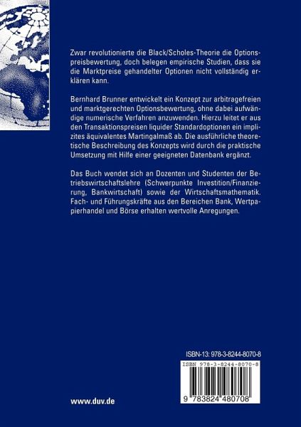 Bernhard Brunner entwickelt ein Konzept zur arbitragefreien und marktgerechten Optionsbewertung, ohne dabei aufwändige numerische Verfahren anzuwenden. Hierzu leitet er aus den Transaktionspreisen liquider Standardoptionen ein implizites äquivalentes Martingalmaß ab. Die ausführliche theoretische Beschreibung des Konzepts wird durch die praktische Umsetzung mit Hilfe einer geeigneten Datenbank ergänzt.