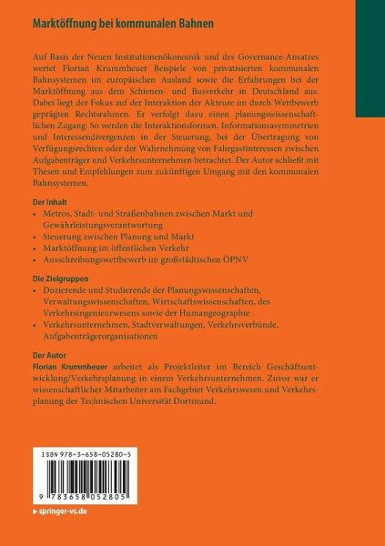 Auf Basis der Neuen Institutionenökonomik und des Governance-Ansatzes wertet Florian Krummheuer Beispiele von privatisierten kommunalen Bahnsystemen im europäischen Ausland sowie die Erfahrungen bei der Marktöffnung aus dem Schienen- und Busverkehr in Deutschland aus. Dabei liegt der Fokus auf der Interaktion der Akteure im durch Wettbewerb geprägten Rechtsrahmen. Er verfolgt dazu einen planungswissenschaftlichen Zugang: So werden die Interaktionsformen, Informationsasymmetrien und Interessendivergenzen in der Steuerung, bei der Übertragung von Verfügungsrechten oder der Wahrnehmung von Fahrgastinteressen zwischen Aufgabenträger und Verkehrsunternehmen betrachtet. Der Autor schließt mit Thesen und Empfehlungen zum zukünftigen Umgang mit den kommunalen Bahnsystemen .
