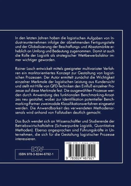 Der Autor entwickelt mittels geeigneter multivariater Verfahren ein marktorientiertes Konzept zur Gestaltung von logistischen Prozessen. Die Anwendbarkeit des Methodenarsenals wird durch Fallstudien deutlich gemacht.