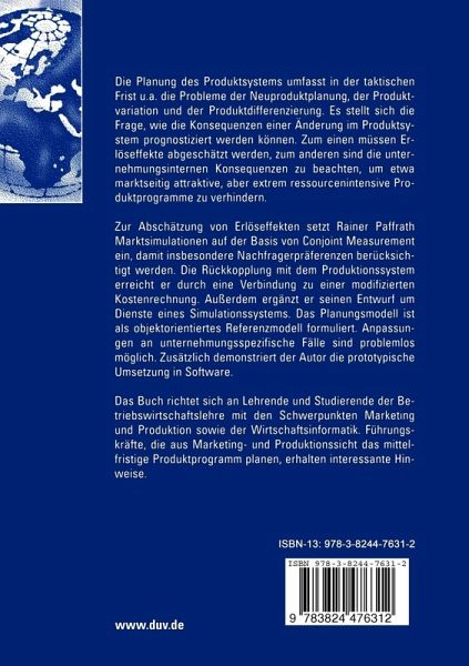Zur Abschätzung von Erlöseffekten setzt Rainer Paffrath Marktsimulationen auf der Basis von Conjoint Measurement ein, damit insbesondere Nachfragerpräferenzen berücksichtigt werden. Die Rückkopplung mit dem Produktionssystem erreicht er durch eine Verbindung zu einer modifizierten Kostenrechnung. Außerdem ergänzt er seinen Entwurf um Dienste eines Simulationssystems. Das Planungsmodell ist als objektorientiertes Referenzmodell formuliert. Anpassungen an unternehmungsspezifische Fälle sind problemlos möglich. Zusätzlich demonstriert der Autor die prototypische Umsetzung in Software.