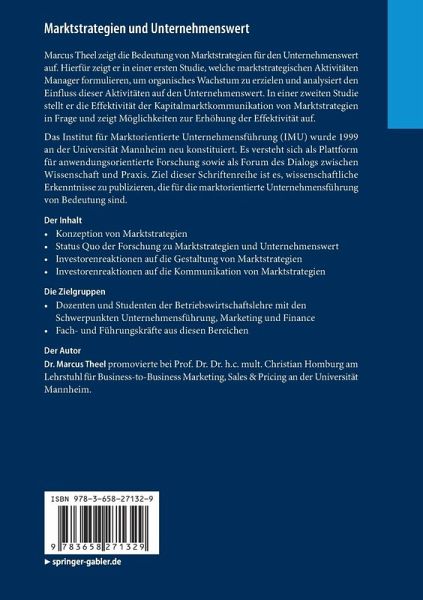 Marcus Theel zeigt die Bedeutung von Marktstrategien für den Unternehmenswert auf. Hierfür zeigt er in einer ersten Studie, welche marktstrategischen Aktivitäten Manager formulieren, um organisches Wachstum zu erzielen und analysiert den Einfluss dieser Aktivitäten auf den Unternehmenswert. In einer zweiten Studie stellt er die Effektivität der Kapitalmarktkommunikation von Marktstrategien in Frage und zeigt Möglichkeiten zur Erhöhung der Effektivität auf.
