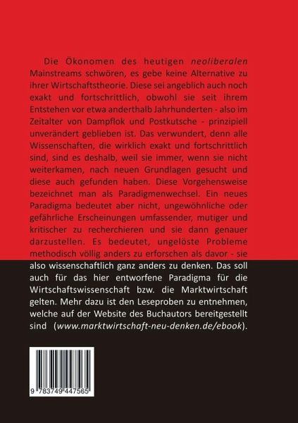 Die Ökonomen des heutigen neoliberalen Mainstreams schwören, es gebe keine Alternative zu ihrer Wirtschaftstheorie. Diese sei angeblich auch noch exakt und fortschrittlich, obwohl sie seit ihrem Entstehen vor etwa anderthalb Jahrhunderten, also im Zeitalter von Dampflok und Postkutsche, prinzipiell unverändert geblieben ist. Das verwundert, denn alle Wissenschaften, die wirklich exakt und fortschrittlich sind, sind es deshalb, weil sie immer dann, wenn sie nicht weiterkamen, nach neuen Grundlagen gesucht und diese auch gefunden haben. Diese Vorgehensweise bezeichnet man als Paradigmenwechsel. Ein Paradigmenwechsel bedeutet aber nicht, ungewöhnliche oder bedrohliche Erscheinungen vollständiger, mutiger und kritischer zu recherchieren und sie dann anders zu interpretieren. Paradigmenwechsel bedeutet die Probleme methodisch grundsätzlich anders zu erforschen als davor - sie also wissenschaftlich völlig anders zu denken. Allgemein betrachtet, muss ein neues Paradigma zwei Voraussetzungen erfüllen, um Aussicht auf Erfolg zu haben: Zum einen darf es nicht weniger schlüssig und komplex als das vorhergehende sein. Zum anderen muss es ihm gelingen, Erklärungen für empirische Zusammenhänge und Lösungen für praktische Probleme zu erbringen, die sein Vorgänger nicht bieten konnte. Das soll auch für das hier entworfene neue Paradigma für die Wirtschaftswissenschaft bzw. die Marktwirtschaft gelten. Mehr dazu ist den Leseproben zu entnehmen, die auf der Website des Buchautors bereitgestellt sind (www.marktwirtschaft-neu-denken.de/ebook). Neben dem, was sich schon aus Titel und Untertitel unmittelbar herauslesen lässt, wird der inhaltliche Rahmen des Buches auch noch durch die folgenden Stichwörter abgesteckt: Nachfragemangel und Nachfrageschaffung, monetäre und reale Nachfragetheorie, zwei Möglichkeiten zur Herstellung von Ordnung: Steuerung und Regelung, geregelte statt "freie" Marktordnung, demokratische Geldschöpfung, demokratische Geldmengenregelung.