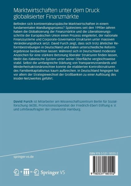 Befinden sich kontinentaleuropäische Marktwirtschaften in einem fundamentalen Wandlungsprozess? Spätestens seit den 1990er-Jahren haben die Globalisierung der Finanzmärkte und die Liberalisierungsschritte der Europäischen Union einen Prozess eingeleitet, der nationale Finanzsysteme und Corporate-Governance-Strukturen unter massiven Veränderungsdruck setzt. David Furch zeigt, dass sich trotz ähnlicher Reformbestrebungen in Deutschland und Italien unterschiedliche Reformergebnisse beobachten lassen: Während sich in Deutschland moderate Anzeichen für eine stärkere Betonung liberaler Strukturen finden lassen, bleibt das italienische System unter seiner Oberfläche vergleichsweise stabil. Selbst die umfangreiche Stärkung von Transparenzstandards und Minderheitsaktionärsrechten konnte die etablierten Kontrollstrukturen des Familienkapitalismus kaum aufbrechen. In Deutschland hingegen hat vor allem der Strategiewechsel der Großbanken zu einer Auflösung des Insider-Netzwerkes geführt.
