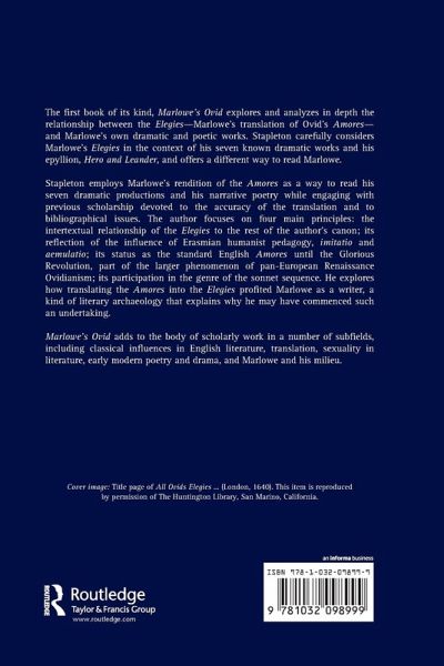 The first book of its kind, Marlowe's Ovid explores and analyzes in depth the relationship between the Elegies-Marlowe's translation of Ovid's Amores-and Marlowe's own dramatic and poetic works. Stapleton carefully considers Marlowe's Elegies in the context of his seven known dramatic works and his epyllion, Hero and Leander, and offers a different way to read Marlowe. Stapleton employs Marlowe's rendition of the Amores as a way to read his seven dramatic productions and his narrative poetry while engaging with previous scholarship devoted to the accuracy of the translation and to bibliographical issues. The author focuses on four main principles: the intertextual relationship of the Elegies to the rest of the author's canon; its reflection of the influence of Erasmian humanist pedagogy, imitatio and aemulatio; its status as the standard English Amores until the Glorious Revolution, part of the larger phenomenon of pan-European Renaissance Ovidianism; its participation in the genre of the sonnet sequence. He explores how translating the Amores into the Elegies profited Marlowe as a writer, a kind of literary archaeology that explains why he may have commenced such an undertaking. Marlowe's Ovid adds to the body of scholarly work in a number of subfields, including classical influences in English literature, translation, sexuality in literature, early modern poetry and drama, and Marlowe and his milieu.