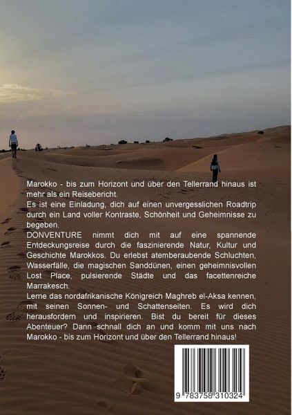 Marokko - bis zum Horizont und über den Tellerrand hinaus ist nicht nur ein spannender Reisebericht, sondern auch eine Einladung zu einem unvergesslichen Roadtrip durch ein faszinierendes Land. DONVENTURE zeigt dir Naturwunder, die Kulturvielfalt und Geschichte Marokkos. Du entdeckst atemberaubende Landschaften, geheimnisvolle Orte, pulsierende Städte und lernst das facettenreiche nordafrikanische Königreich mit seinen Licht- und Schattenseiten kennen. Es wird dich begeistern und herausfordern. Bist du bereit für dieses Abenteuer? Dann komm mit uns nach Marokko - bis zum Horizont und über den Tellerrand hinaus!