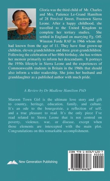 Gloria was the third child of Mr. Charles and Mrs. Patience Le-Grand Hamilton of 28 Percival Street, Freetown Sierra Leone. After a happy childhood, she travelled to the United Kingdom to complete her tertiary studies. She settled in England on marrying Fg. Off. Winston Forde RAF in 1966 whom she had known from the age of 11. They have four grown-up children, eleven grandchildren and three great-grandchildren. Following the celebration of her 80th birthday, she has written her memoir primarily to inform her descendants. It portrays the 1950s lifestyle in Sierra Leone and the experiences of Commonwealth students in Britain in the 1960s that should also inform a wider readership. She joins her husband and granddaughter as a published author with much pride. A Review by Dr Madlene Hamilton PhD Maroon Town Girl is the ultimate love story and gift to country, heritage, education, family, and culture. It's an ode to the bourgeoisie, a reflection of self, and a true pleasure to read. It's the only piece I've read related to Sierra Leone that is not centred on poverty, violence, war, or disease, except when those elements are intercepted with the main plot. Congratulations on this remarkable accomplishment.