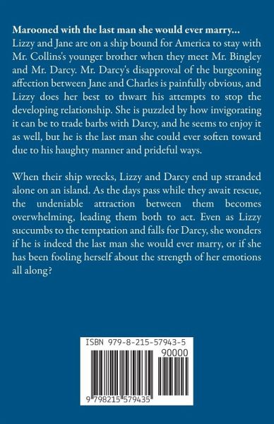 Marooned with the last man she would ever marry... Lizzy and Jane are on a ship bound for America to stay with Mr. Collins's younger brother when they meet Mr. Bingley and Mr. Darcy. Mr. Darcy's disapproval of the burgeoning affection between Jane and Charles is painfully obvious, and Lizzy does her best to thwart his attempts to stop the developing relationship. She is puzzled by how invigorating it can be to trade barbs with Darcy, and he seems to enjoy it as well, but he is the last man she could ever soften toward due to his haughty manner and prideful ways. When their ship wrecks, Lizzy and Darcy end up stranded alone on an island. As the days pass while they await rescue, the undeniable attraction between them becomes overwhelming, leading them both to act. Even as Lizzy succumbs to the temptation and falls for Darcy, she wonders if he is indeed the last man she would ever marry, or if she has been fooling herself about the strength of her emotions all along? While Abbey sometimes writes sweet JAFF, this is strictly SENSUAL.