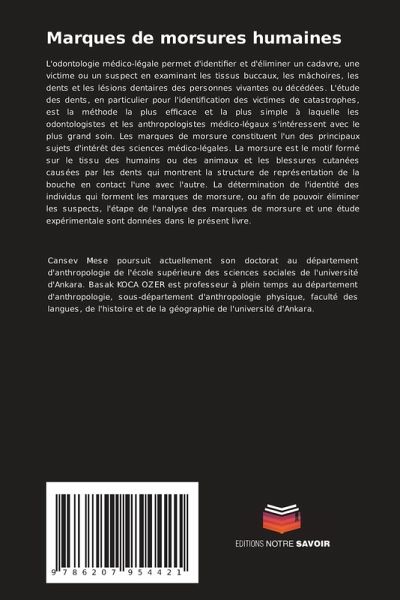 L'odontologie médico-légale permet d'identifier et d'éliminer un cadavre, une victime ou un suspect en examinant les tissus buccaux, les mâchoires, les dents et les lésions dentaires des personnes vivantes ou décédées. L'étude des dents, en particulier pour l'identification des victimes de catastrophes, est la méthode la plus efficace et la plus simple à laquelle les odontologistes et les anthropologistes médico-légaux s'intéressent avec le plus grand soin. Les marques de morsure constituent l'un des principaux sujets d'intérêt des sciences médico-légales. La morsure est le motif formé sur le tissu des humains ou des animaux et les blessures cutanées causées par les dents qui montrent la structure de représentation de la bouche en contact l'une avec l'autre. La détermination de l'identité des individus qui forment les marques de morsure, ou afin de pouvoir éliminer les suspects, l'étape de l'analyse des marques de morsure et une étude expérimentale sont données dans le présent livre.