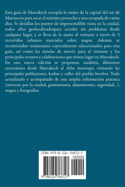 Esta guía de Marrakech recopila lo mejor de la capital del sur de Marruecos para sacar el máximo provecho a una escapada de varios días. Se detallan los puntos de imprescindible visita en la ciudad, todos ellos geolocalizadospara acceder sin problemas desde cualquier lugar, y se lleva de la mano al visitante a través de 5 recorridos urbanos marcados sobre mapas. Además se recomiendan restaurantes especialmente seleccionados para esta guía, así como las tiendas de interés para el visitante y los principales eventos y celebraciones que tienen lugar en Marrakech. En esta nueva edición se proponen, también, diferentes excursiones desde Marrakech al Atlas marroquí, visitando las principales poblaciones, kasbas y valles del pueblo bereber. Todo actualizado y acompañado de una amplia información práctica (moverse por la ciudad, gastronomía, alojamientos, seguridad...), mapas y fotografías.