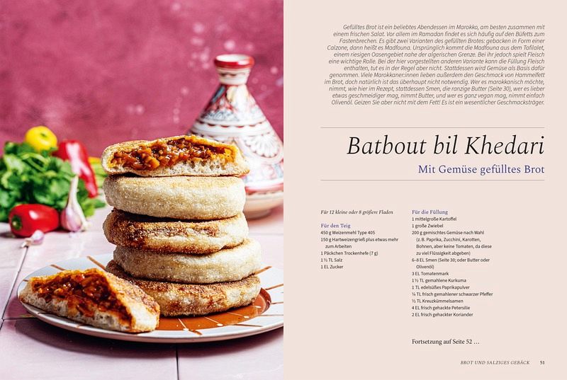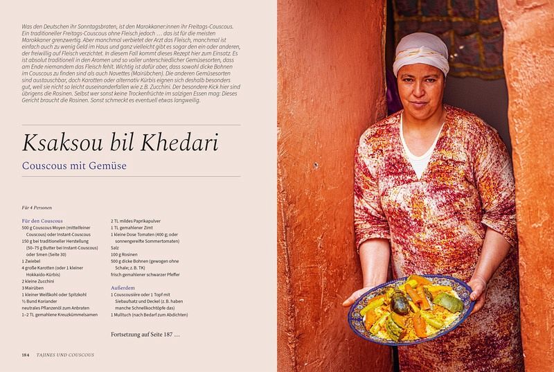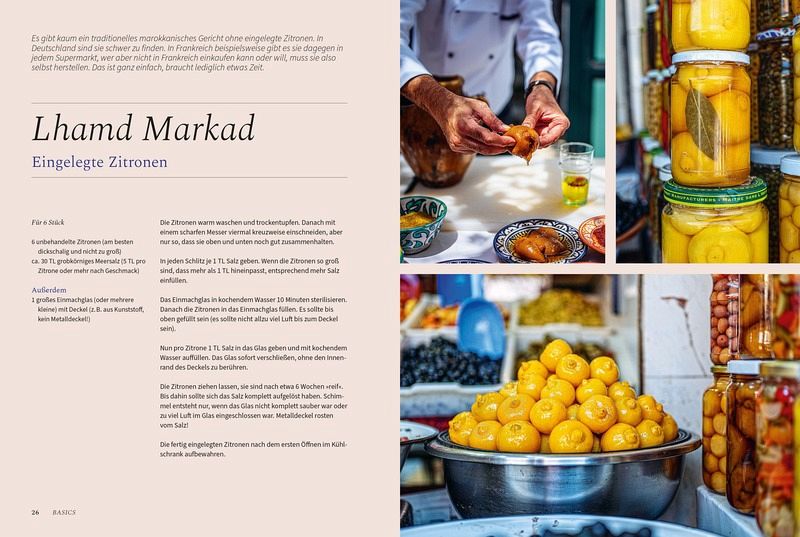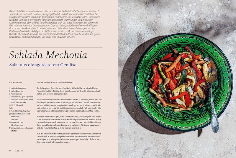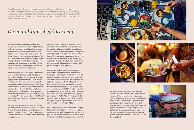 Los geht es mit einer kurzen Einführung, danach kommen auch schon die Basics, ehe es an Brot und salziges Gebäck geht. Danach folgen in weiteren Kapiteln Salate, Vorspeisen, Suppen, Gemüsegerichte. Natürlich gibt es Anleitungen für die einzigartigen Tajines und Couscous. Und Süßes darf auch nicht fehlen. Bei all diesen Rezepten finden sich Leckereien wie Tomaten im Zimtsud, einem Orangenkuchen oder Süßkartoffelmarmelade.