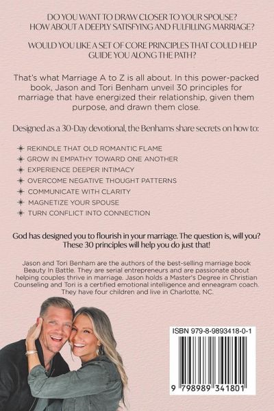 Do you want to draw closer to your spouse? How about a deeply satisfying and fulfilling marriage? Would you like a set of core principles that could help guide you along the path? That's what Marriage A to Z is all about. In this power-packed book, Jason and Tori Benham unveil 30 principles for marriage that have energized their relationship, given them purpose, and drawn them close. Designed as a 30-Day devotional, the Benhams share secrets on how to: * Rekindle that old romantic flame * Grow in empathy toward one another * Experience deeper intimacy * Overcome negative thought patterns * Communicate with clarity * Magnetize your spouse * Turn conflict into connection God has designed you to flourish in your marriage. The question is, will you? These 30 principles will help you do just that! Jason and Tori Benham are the authors of the best-selling marriage book Beauty In Battle. They are serial entrepreneurs and are passionate about helping couples thrive in marriage. Jason holds a Master's Degree in Christian Counseling and Tori is a certified emotional intelligence and enneagram coach. They have four children and live in Charlotte, NC.