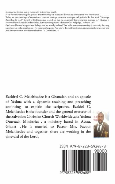 Marriage has been an area of controversy in the whole world . Many have taken marriage for granted ,they think they can marry and divorce any time at their own convenience. Today we have marriage of convenience, contract marriage ,same-sex marriages and so forth .In this book " Marriage According To God " the will of God is revealed to us all ,so that we can actually know what real marriage is . " Marriage is Honourable in all and the bed undefiled ,but whoremongers and adulterers God will judge ." Hebrews 13:4 God created human beings to have feelings, that are sexually inclined. That is the more reason marriage is a necessity for every one who want to be morally pure . For instance the apostle Paul said "... To avoid fornication ,let every man have his own wife ,and let every woman have her own husband ." 1 Corinthians 7:2