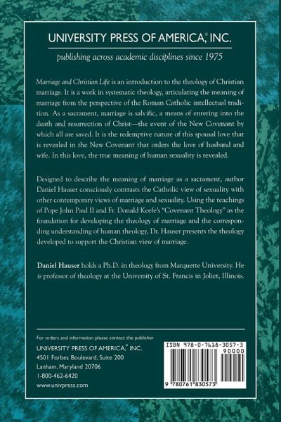 Marriage and Christian Life is an introduction to the theology of Christian marriage. Designed to describe the meaning of marriage as a sacrament, author Daniel Hauser consciously contrasts the Catholic view of sexuality with contemporary views of marriage and sexuality. Using the teachings of Pope John Paul II on sexuality, and Fr. Donald Keefe's "Covenant Theology" as the foundation for developing the theology of marriage and the corresponding understanding of human theology, Dr. Hauser presents the theology developed to support the Christian view of marriage.