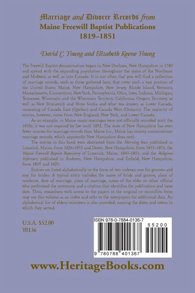 The Freewill Baptist denomination began in New Durham, New Hampshire in 1780 and spread with the expanding population throughout the states of the Northeast and Midwest, as well as into Canada. It is not often that you will find a collection of marriage records, such as those gathered here, that cover such a vast portion of the United States: Maine, New Hampshire, New Jersey, Rhode Island, Vermont, Massachusetts, Connecticut, New York, Pennsylvania, Ohio, Iowa, Indiana, Michigan, Tennessee, Wisconsin and the Wisconsin Territory, California, Oregon Territory, as well as New Brunswick and Nova Scotia and what was known as Lower Canada, consisting of Canada East (Quebec) and Canada West (Ontario). The majority of entries, however, come from New England, New York, and Lower Canada. As an example, in Maine many marriages were not officially recorded until the 1830s; it was not required by law until 1892. The state of New Hampshire has even fewer sources for marriage records than Maine (i.e., Maine has county commissioner marriage records, which apparently New Hampshire does not). The entries in this book were abstracted from the Morning Star, published in Limerick, Maine, from 1826–1833 and Dover, New Hampshire, from 1833–1851; the Maine Freewill Baptist Repository of Limerick, Maine, 1843–1851; and the Religious Informer, published in Andover, New Hampshire, and Enfield, New Hampshire, from 1819 and 1825. Entries are listed alphabetically in the form of two indexes; one for grooms and one for brides. A typical entry includes the name of bride and groom, place of residence, date of marriage, place of marriage, name of the elder or other official who performed the ceremony, and a citation that identifies the publication and issue date. Thus, researchers with access to the papers in the original or microfilm form may use this volume as an index and refer to the newspapers for additional data. An alphabetical list of elders/ministers is also provided, naming the dates and towns in which they served.