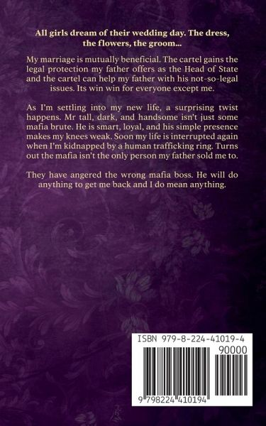 All girls dream of their wedding day. The dress, the flowers, the groom... Being sold to the cartel by their own father. My marriage is mutually beneficial. The cartel gains the legal protection my father offers as the Head of State and the cartel can help my father with his not-so-legal issues. Its win win for everyone except me. As I'm settling into my new life, a surprising twist happens. Mr tall, dark, and handsome isn't just some mafia brute. He is smart, loyal, and his simple presence makes my knees weak. Soon my life is interrupted again when I'm kidnapped by a human trafficking ring. Turns out the mafia isn't the only person my father sold me to. They have angered the wrong mafia boss. He will do anything to get me back and I do mean anything.