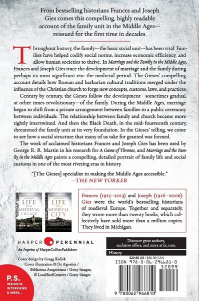 From bestselling historians Frances and Joseph Gies, authors of the classic ?Medieval Life? series, comes this compelling, lucid, and highly readable account of the family unit as it evolved throughout the Medieval period?reissued for the first time in decades. ?Some particular books that I found useful for Game of Thrones and its sequels deserve mention. Life in a Medieval Castle and Life in a Medieval City, both by Joseph and Frances Gies.? ?George R. R. Martin, author of Game of Thrones Throughout history, the significance of the family?the basic social unit?has been vital. In Marriage and the Family in the Middle Ages, acclaimed historians Frances and Joseph Gies trace the development of marriage and the family from the medieval era to early modern times. It describes how the Roman and barbarian cultural streams merged under the influence of the Christian church to forge new concepts, customs, laws, and practices. Century by century, the Gies follow the development?sometimes gradual, at other times revolutionary?of significant components in the history of the family including: * The basic functions of the family as a production unit, as well as its religious, social, judicial, and educational roles. * The shift of marriage from private arrangement between families to public ceremony between individuals, and the adjustments in dowry, bride-price, and counter-dowry. * The development of consanguinity rules and incest taboos in church law and lay custom. * The peasant family in its varying condition of being free or unfree, poor, middling, or rich. * The aristocratic estate, the problem of the younger son, and the disinheritance of daughters. * The Black Death and its long-term effects on the family. * Sex attitudes and customs: the effects of variations in age of men and women at marriage. * The changing physical environment of noble, peasant, and urban families. * Arrangements by families for old age and retirement. Expertly researched, master historians Frances and Joseph Gies?whose books were used by George R.R. Martin in his research for Game of Thrones?paint a compelling, detailed portrait of family life and social customs in one of the most riveting eras in history.