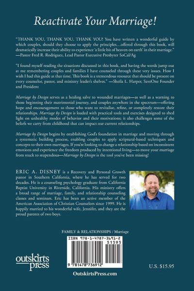 In nearly all cases, couples in marital strife feel a deep sense of hopelessness. The goal of this book is to provide the hope that Christ offers us and present concepts, exercises and techniques that produce results when implemented. Marriages can make the turnaround in spite of some of the most painful hurts imaginable; infidelity, past sexual abuse, forgiving the seemingly unforgivable, pornography and a wide variety of issues by using God's design for marriage. We bolster the dyke by filling the cracks of selfishness and learn to understand and accept differences, identifying how lies we believe affect our relationship, parenting skills, communication, sexual intimacy and addictions are just a few of the issues tackled in propelling a couple forward. Establishing roles and moving beyond our own perceptions and establishing new beliefs are greatly beneficial in walking alongside couples on their road to personal growth and marital fulfillment. Marriage by Design: The Keys to Create, Cultivate and Claim the Marriage You've Always Wanted serves as a healing salve to wounded marriages. It also serves as a warning to those beginning their matrimonial journey and speaks to couples anywhere in the spectrum. A number of tools are employed within its pages to move marriages from stuck to stupendous because hope without practical application will serve little purpose. The exercises are designed to not only shed light on unhealthy current modes of behavior and their motivations but also challenge some of the beliefs that we have carried from childhood and how those can impact our current relationships. Exercises focus on both personal growth and couples enhancement as they move through the many topics within the book. A key goal is for couples to understand the reasoning behind why they do what they do. By educating couples about how closely their feelings and behaviors are related and assessing feelings we have a greater capacity to control those behaviors that create p