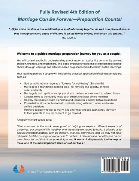 Do you want to marry but you aren't sure how to do it well or how to make it last? Discover the ultimate guide for couples navigating the path from friendship to eternal partnership. Whether you're just starting out or deeply committed, this book is your essential companion. Dive into discussions about values, expectations, and the future you envision together. Explore practical advice on children, finances, communication, and more - all crucial for building a lasting marriage. Enrich your journey with wisdom from the Baha'i Faith, offering profound insights and timeless quotations to strengthen your bond. This isn't just about preparing for a wedding; it's about preparing for a marriage that transcends time. Excellent preparation helps create a marriage that thrives and lasts. Note: The book is also useful for anyone interested in learning more about relationships and marriage from a Baha'i perspective, including doing self-preparation. It's an excellent tool for creating devotional gatherings and group discussions on these topics. The Baha'i teachings say: "...[T]he union must be a true relationship, a spiritual coming together as well as a physical one, so that throughout every phase of life, and in all the worlds of God, their union will endure...." 'Abdu'l-Bahá Your learning path will include the practical application of spiritual principles, such as: God established marriage as a "fortress for well-being" (Bahá'u'lláh); Marriage is a foundation building block for families and society, bringing order and unity; Marriage is both spiritual and physical and the best environment to raise children; Couples strive to thoroughly know each other's character before marriage; Healthy marriages include friendship and respectful equality between partners; Consultation aids couples to build understanding with each other and make unified decisions; Partners decide whether to marry, and after they choose each other, they turn to their parents to ask for consent to go forward Marriage Can Be Forever-Preparation Counts! will be your guide through it all.
