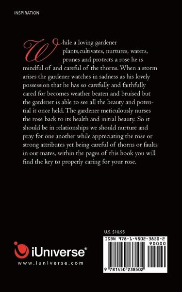 While a loving gardener plants,cultivates, nurtures, waters, prunes and protects a rose he is mindful of and careful of the thorns. When a storm arises the gardener watches in sadness as his lovely possession that he has so carefully and faithfully cared for becomes weather beaten and bruised but the gardener is able to see all the beauty and potential it once held. The gardener meticulously nurses the rose back to its health and initial beauty. So it should be in relationships we should nurture and pray for one another while appreciating the rose or strong attributes yet being careful of thorns or faults in our mates, within the pages of this book you will find the key to properly caring for your rose.