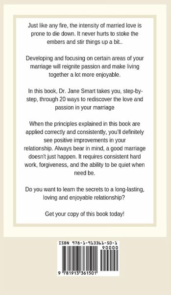 Just like any fire, the intensity of married love is prone to die down. It never hurts to stoke the embers and stir things up a bit.. Developing and focusing on certain areas of your marriage will reignite passion and make living together a lot more enjoyable. In this book, Dr. Jane Smart takes you, step-by-step, through 20 ways to rediscover the love and passion in your marriage. The author shares lessons she learned from her experience offering marriage-counseling services to numerous successful couples with relationships lasting more than 15+ years, as well as, personal experience from her 12 years of marriage. When the principles explained in this book are applied correctly and consistently, you’ll definitely see positive improvements in your relationship. Always bear in mind, a good marriage doesn't just happen. It requires consistent hard work, forgiveness, and the ability to be quiet when need be. ..And when in doubt, remember that sex always helps! Do you want to learn the secrets to a long-lasting, loving and enjoyable relationship? Get your copy of this book today!