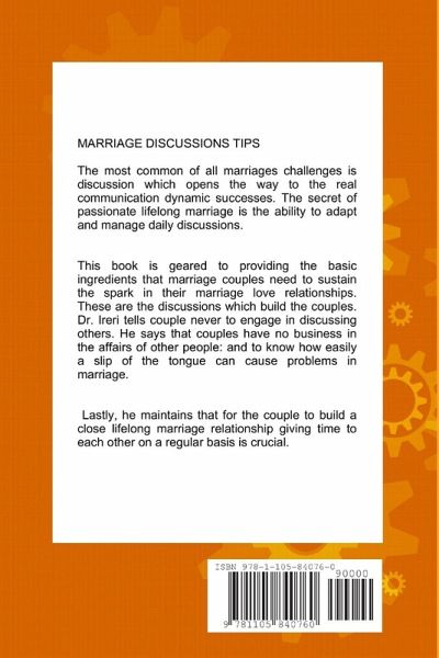 MARRIAGE DISCUSSIONS TIPS The most common of all marriages challenges is discussion which opens the way to the real communication dynamic successes. The secret of passionate lifelong marriage is the ability to adapt and manage daily discussions. This book is geared to providing the basic ingredients that marriage couples need to sustain the spark in their marriage love relationships. These are the discussions which build the couples. Dr. Ireri tells couple never to engage in discussing others. He says that couples have no business in the affairs of other people: and to know how easily a slip of the tongue can cause problems in marriage. Lastly, he maintains that for the couple to build a close lifelong marriage relationship giving time to each other on a regular basis is crucial.