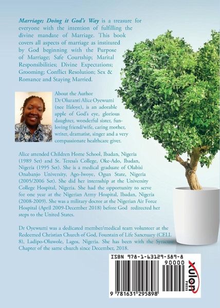 Marriage; Doing it God's Way is a treasure for everyone with the intention of fulfilling the divine mandate of Marriage. This book covers all aspects of marriage as instituted by God beginning with the Purpose of Marriage; Safe Courtship; Marital Responsibilities; Divine Expectations; Grooming; Conflict Resolution; Sex & Romance and Staying Married. About the AuthorDr Oluranti Alice Oyewumi (nee Ifaloye), is an adorable apple of God's eye, glorious daughter, wonderful sister, fun-loving friend/wife, caring mother, writer, dramatist, singer and a very compassionate healthcare giver.Alice attended Children Home School, Ibadan, Nigeria (1989 Set) and St. Teresa's College, Oke-Ado, Ibadan, Nigeria (1995 Set). She is a medical graduate of Olabisi Onabanjo University, Ago-Iwoye, Ogun State, Nigeria (2005/2006 Set). She did her internship at the University College Hospital, Nigeria. She had the opportunity to serve for one year at the Nigerian Army Hospital, Ibadan, Nigeria (2008-2009). She was a military doctor at the Nigerian Air Force Hospital (April 2009-December 2018) before God redirected her steps to the United States.Dr Oyewumi was a dedicated member/medical team volunteer at the Redeemed Christian Church of God, Fountain of Life Sanctuary (CELL 8), Ladipo-Oluwole, Lagos, Nigeria. She has been with the Syracuse Chapter of the same church since December, 2018.