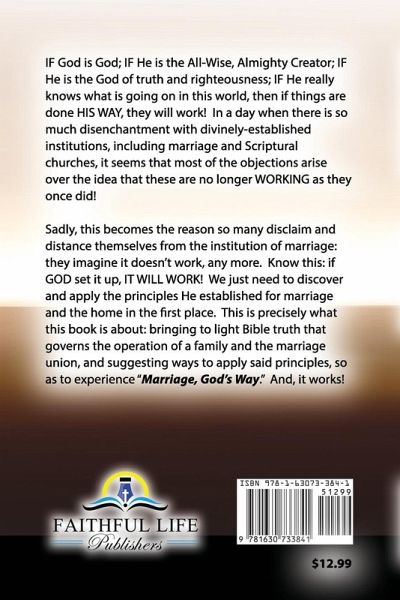 IF God is God; IF He is the All-Wise, Almighty Creator; IF He is the God of truth and righteousness; IF He really knows what is going on in this world, then if things are done HIS WAY, they will work! In a day when there is so much disenchantment with divinely-established institutions, including marriage and Scriptural churches, it seems that most of the objections arise over the idea that these are no longer WORKING as they once did! Sadly, this becomes the reason so many disclaim and distance themselves from the institution of marriage: they imagine it doesn't work, anymore. Know this: if GOD sets it up, IT WILL WORK! We just need to discover and apply the principles He established for marriage and the home in the first place. This is precisely what this book is about: bringing to light Bible truth that governs the operation of a family and the marriage union, and suggesting ways to apply said principles, so as to experience "Marriage, God's Way." And, it works!