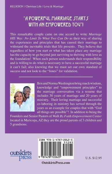 "A powerful marriage starts with an empowered YOU"! This remarkable couple came on one accord to write Marriage HIS Way: No Limit To What Two Can Do as their way of sharing the experiences and principles that has caused their marriage to withstand the inevitable trials that life presents. They believe that regardless of how you start or what has taken place any marriage has the capacity to go beyond just surviving to thriving with love as the foundation! When each person understands their responsibility and is willing to do what is necessary to have a successful marriage it can't fail; also knowing that we must set our own standard of success and not look to the "Jones" for validation. There are many self-help books on marriage, marriage seminars and marriage conferences along with an array of marriage coaches today that claim to have all the answers on how to have a successful marriage relationship; but unfortunately much of this information or advice is nothing more than recycled cliché.