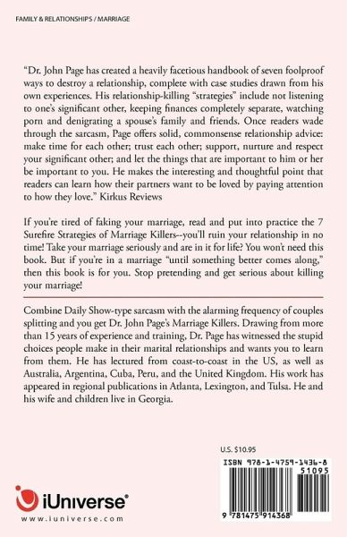 "Dr. John Page has created a heavily facetious handbook of seven foolproof ways to destroy a relationship, complete with case studies drawn from his own experiences. His relationship-killing "strategies" include not listening to one's signifi cant other, keeping finances completely separate, watching porn and denigrating a spouse's family and friends. Once readers wade through the sarcasm, Page offers solid, commonsense relationship advice: make time for each other; trust each other; support, nurture and respect your significant other; and let the things that are important to him or her be important to you. He makes the interesting and thoughtful point that readers can learn how their partners want to be loved by paying attention to how they love." Kirkus Reviews If you're tired of faking your marriage, read and put into practice the 7 Surefi re Strategies of Marriage Killers--you'll ruin your relationship in no time! Take your marriage seriously and are in it for life? You won't need this book. But if you're in a marriage "until something better comes along," then this book is for you. Stop pretending and get serious about killing your marriage!