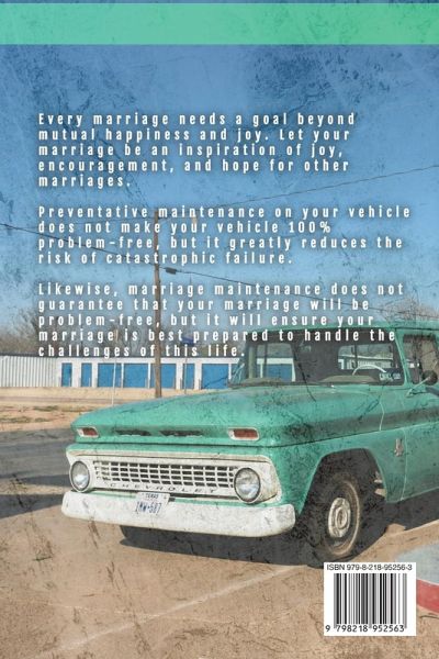 This is a facilitator guide for use in a 10-week Marriage Maintenance group. Each facilitator should have his or her own copy. Participant guides are available for guidance throughout the course, and each participant should have his or her own book. Every marriage needs a goal beyond mutual happiness and joy. Let your marriage be an inspiration of joy, encouragement, and hope for other marriages. Preventative maintenance on your vehicle does not guarantee your vehicle will be 100% problem-free, but it greatly reduces the risk of catastrophic failure. Likewise, marriage maintenance does not guarantee that your marriage will be problem-free, but it will ensure your marriage is best prepared to handle the challenges of this life. This book relies on biblical principals and draws from wisdom of other sources as well as real-life experiences of the authors. It is written by broken people who have experienced failed marriages and want to help others avoid some of the pitfalls that often befall marriages.