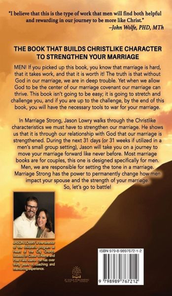 THE BOOK THAT BUILDS CHRISTLIKE CHARACTER TO STRENGTHEN YOUR MARRIAGE MEN! If you picked up this book, you know that marriage is hard, that it takes work, and that it is worth it! The truth is that without God in our marriage, we are in deep trouble. Yet when we allow God to be the center of our marriage covenant our marriage can thrive. This book isn't going to be easy; it is going to stretch and challenge you, and if you are up to the challenge, by the end of this book, you will have the necessary tools to war for your marriage. In Marriage Strong, Jason Lowry walks through the Christlike characteristics we must have to strengthen our marriage. He shows us that it is through our relationship with God that our marriage is strengthened. During the next 31 days (or 31 weeks if utilized in a men's small group setting), Jason will take you on a journey to move your marriage forward like never before. Most marriage books are for couples, this one is designed specifically for men. Men, we are responsible for setting the tone in a marriage. Marriage Strong has the power to permanently change how men impact your spouse and the strength of your marriage. So, let's go to battle!