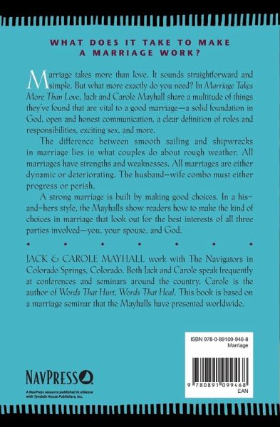 The difference between smooth sailing and shipwrecks in marriage lies in what couples do about rough weather. A strong marriage is built by making good choices. In a his-and-hers style, Carol and Jack Mayhall show you how to make the kind of choices in marriage that look out for the best interests of all three parties involved: you, your spouse, and God.